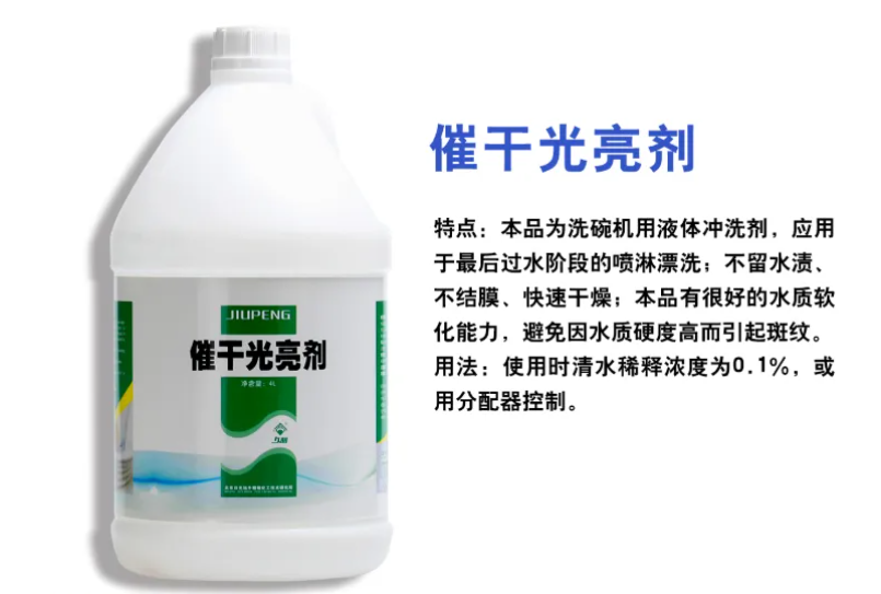 久朋 催干光亮剂 针对洗碗机用液体冲洗剂,应用于最后过水阶段的喷淋漂洗。不留水渍,不结膜,快速干燥,本品有很好的水质软化能力。