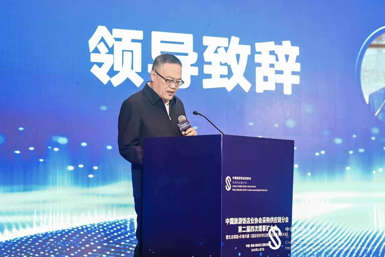 中国旅游饭店业协会副秘书长张维先生致辞,他表示:本届大会以 “生态赋能,价值共赢” 为主题,旨在汇聚产业链上下游的智慧与力量,共同探索酒店纺织领域协同创新、降本增效与绿色发展的新路径。这不仅是应对当前挑战的必然选择,更是驱动行业未来高质量发展的关键引擎。希望各位同仁能充分利用这一平台,深入交流,凝聚共识,共同推动酒店纺织供应链向更高效、更可持续的未来迈进。