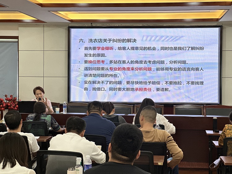 马国庆向学员讲解了中央工厂洗涤技术与水洗机编程相关知识,内容包括中央工厂洗涤工作流程与操作规范,如洗涤前准备、水洗步骤、烘干注意事项等,还介绍了如何参照标准洗涤工艺优化洗涤程序编程,涉及水洗机编程的具体步骤和参数设置等内容。